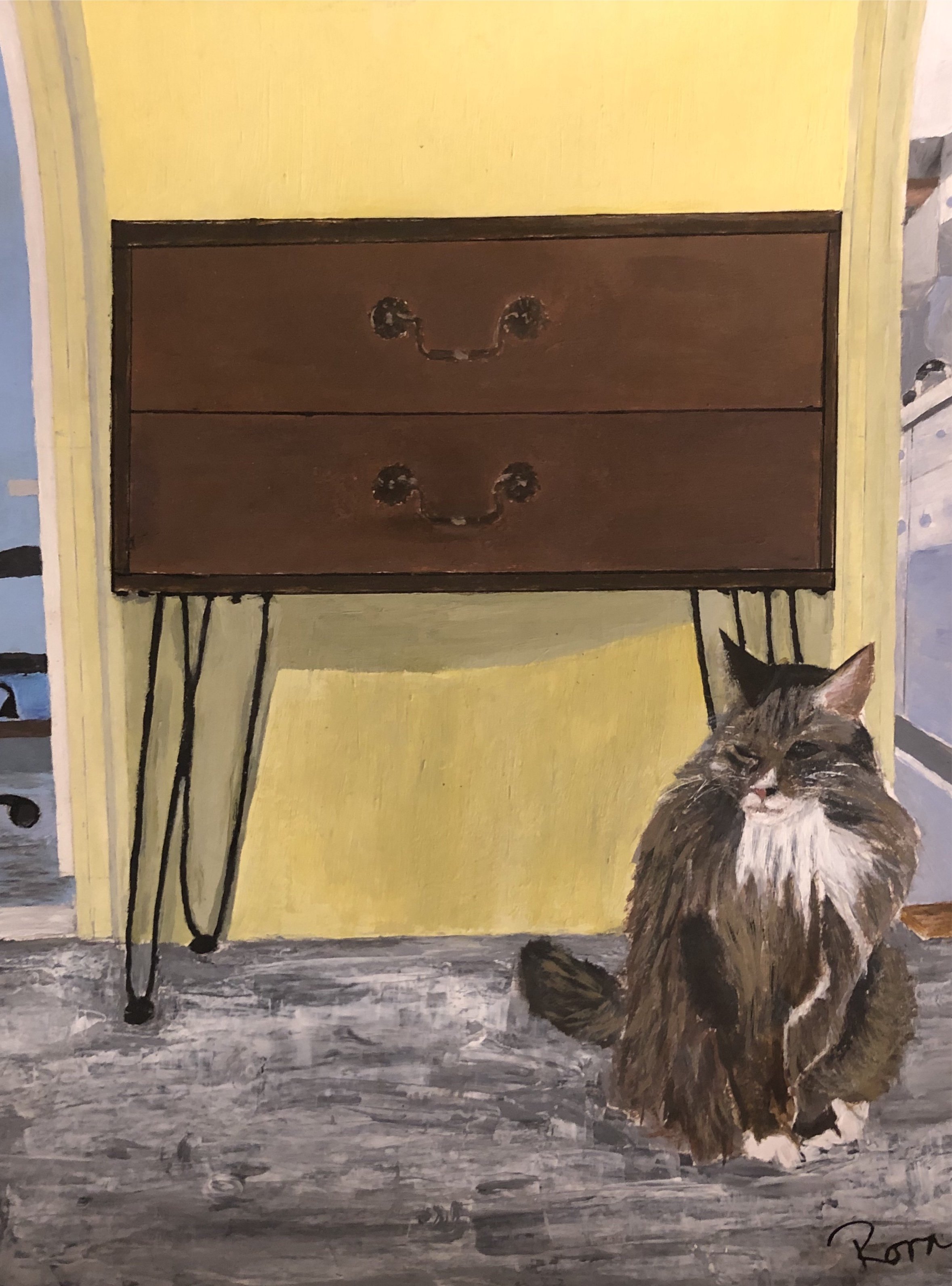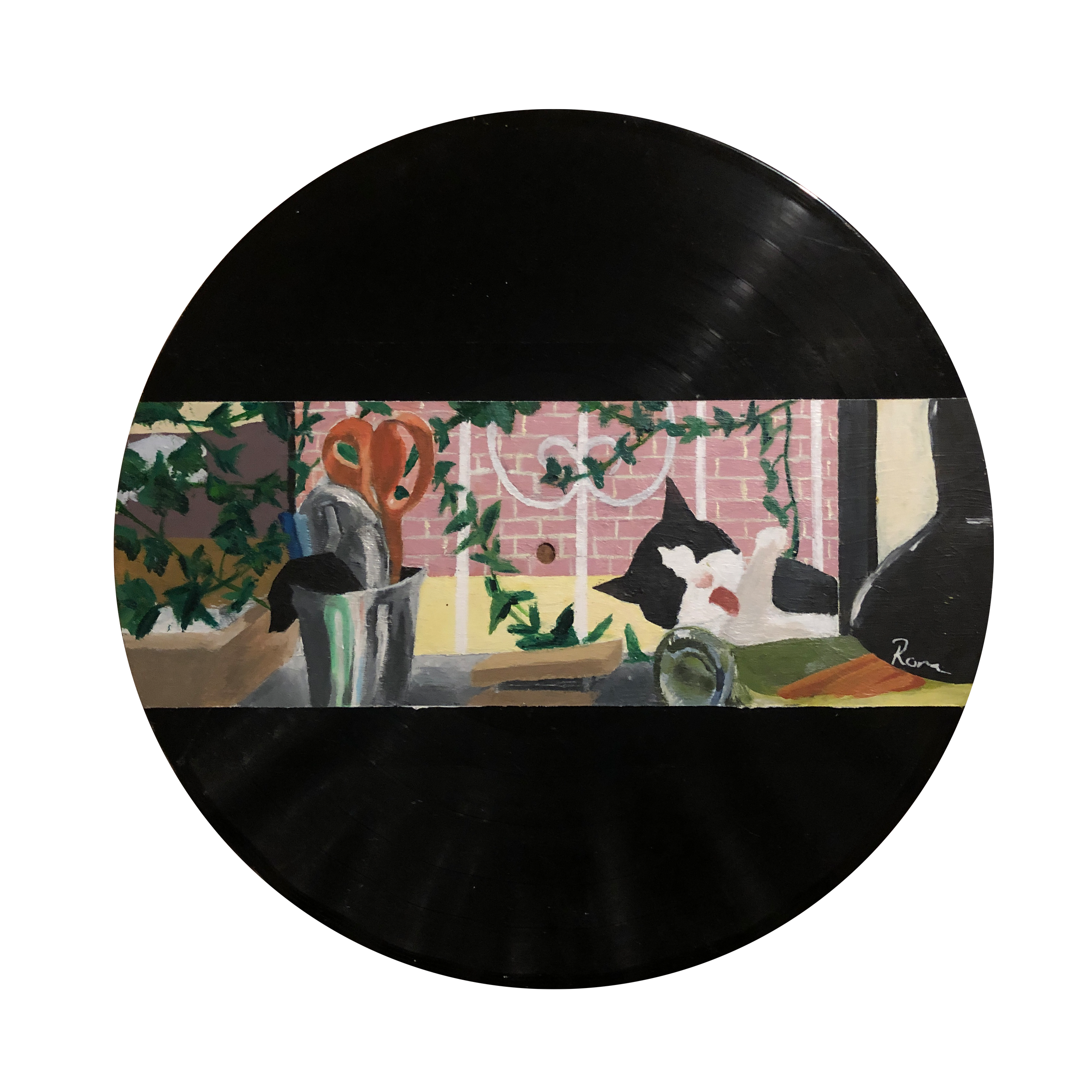 The first two paintings are acrylic on bristol, the last painting was done on a water damaged record with acrylic paint. All the paintings are displayed in the locations they depict, immortalising the cats and giving the viewer a glimpse into their relationship with the space.