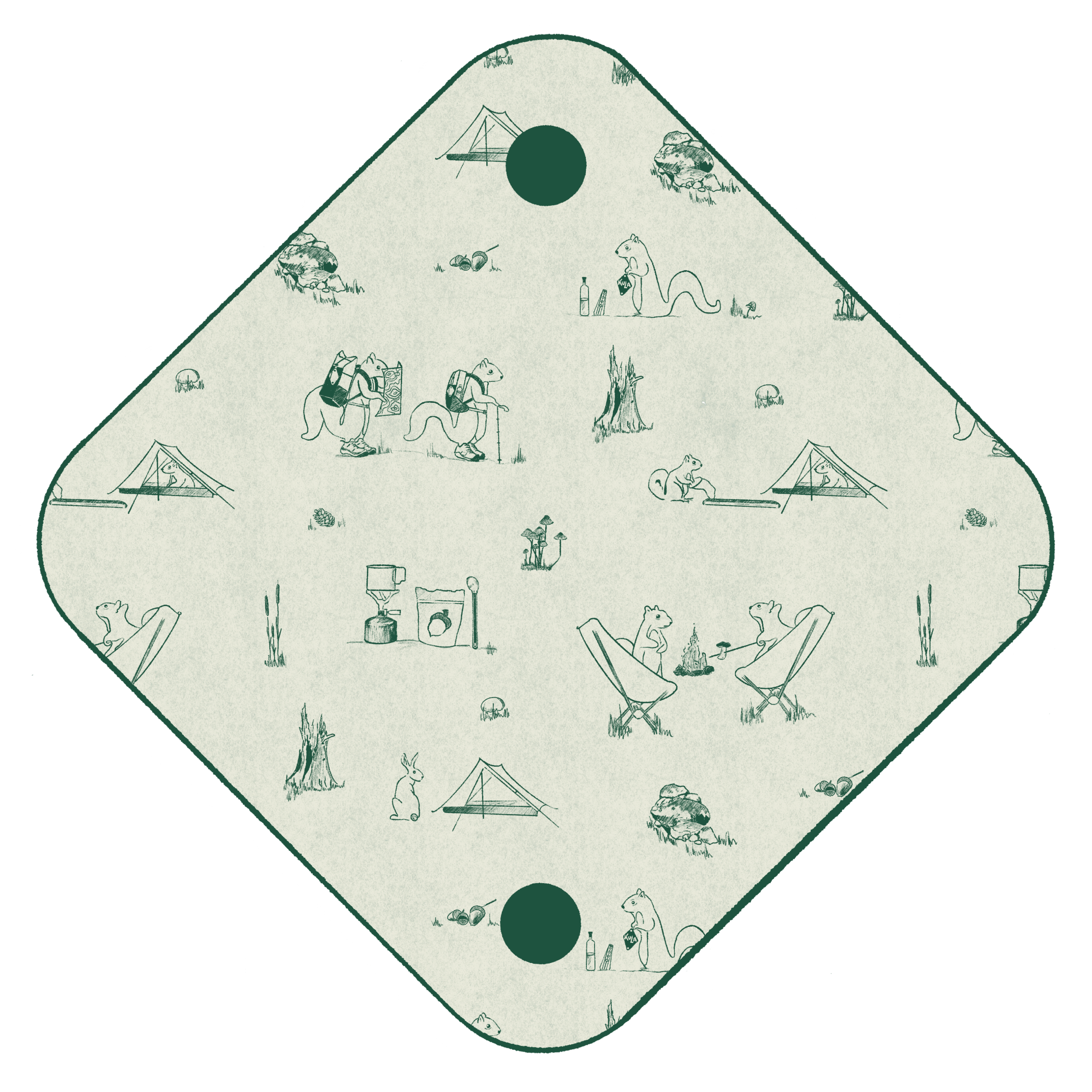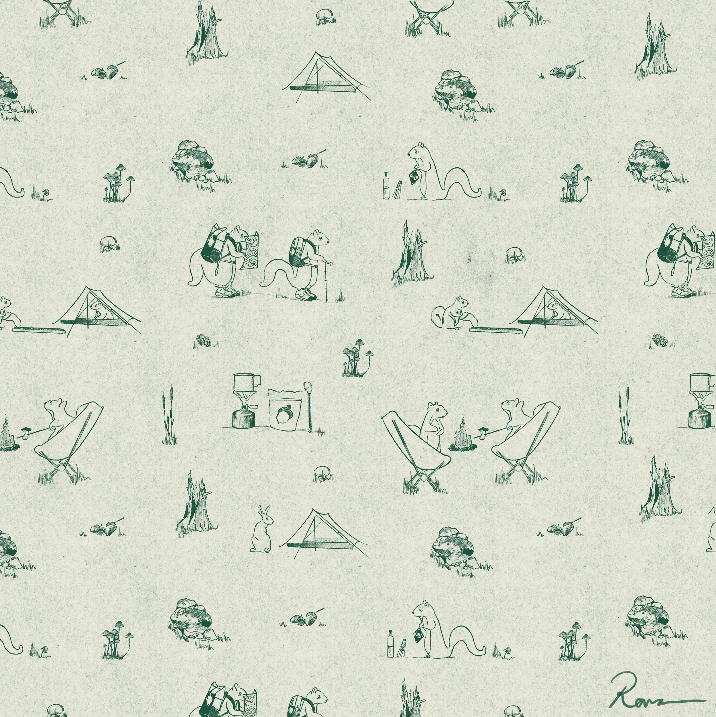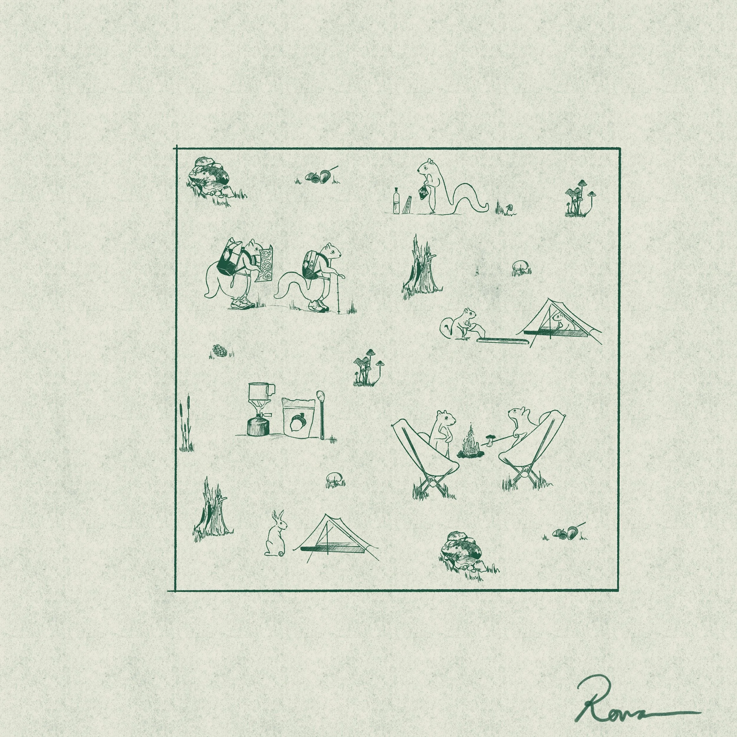 Entered in the 2024 Kula Cloth Design competition to be printed on an antimicrobial outdoor cloth. I was inspired by the French textile print toile de jouy and wanted to create a repeating pattern that also told a story. These scenes depicts two Squirrel friends, Stan and Sebastian, as they venture into the great outdoors and set up camp. The gear depicted in this illustration is gear that I love and that is renowned in the ultralight community for being cottage made by small businesses. Other aspects and motif in the illustration are informed by my interest in mycology and foraging for edible plants/materials to make my own ink with. I added a hidden rabbit as a sort of a scavenger hunt and twist to the storyline but also as an informal signature.